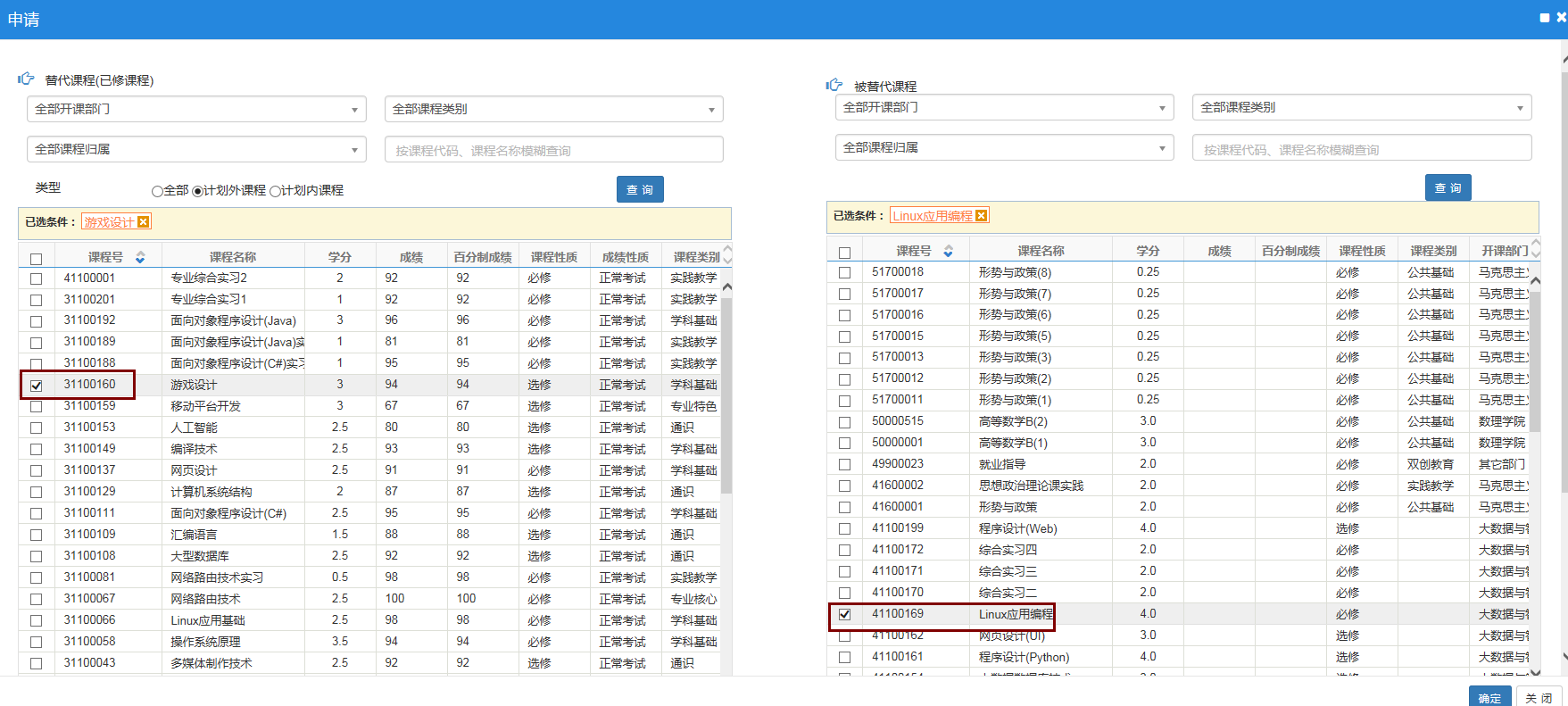 4、进入界面之后,左边是计划外课程(就是你修的培养方案之外的课程),右边是计划内课程(培养方案内的课程)。按照学分替换规则(见附件,另外在系统通知栏中也有发布),勾选你要进行替换的课程,用左边的课程替换右边的课程。可以一门换多门,也可以多门换一门(只要符合学分替换规则)。