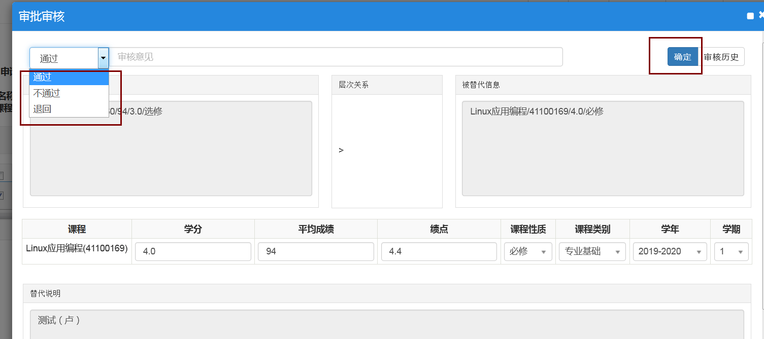5、根据学分替换规则,教秘选择审核意见(如教秘可以确定,就直接选择,如不能确定,可征询员工所在教研室主任意见或公司主管教学副经理意见后,进行审核),在这里可以选择“通过”还是“不通过”,或“退回”,然后填写审核意见,然后点右边“确定”,完成审核,如果是“通过”则审核流程进入到公司主管教学副经理处进行审核。