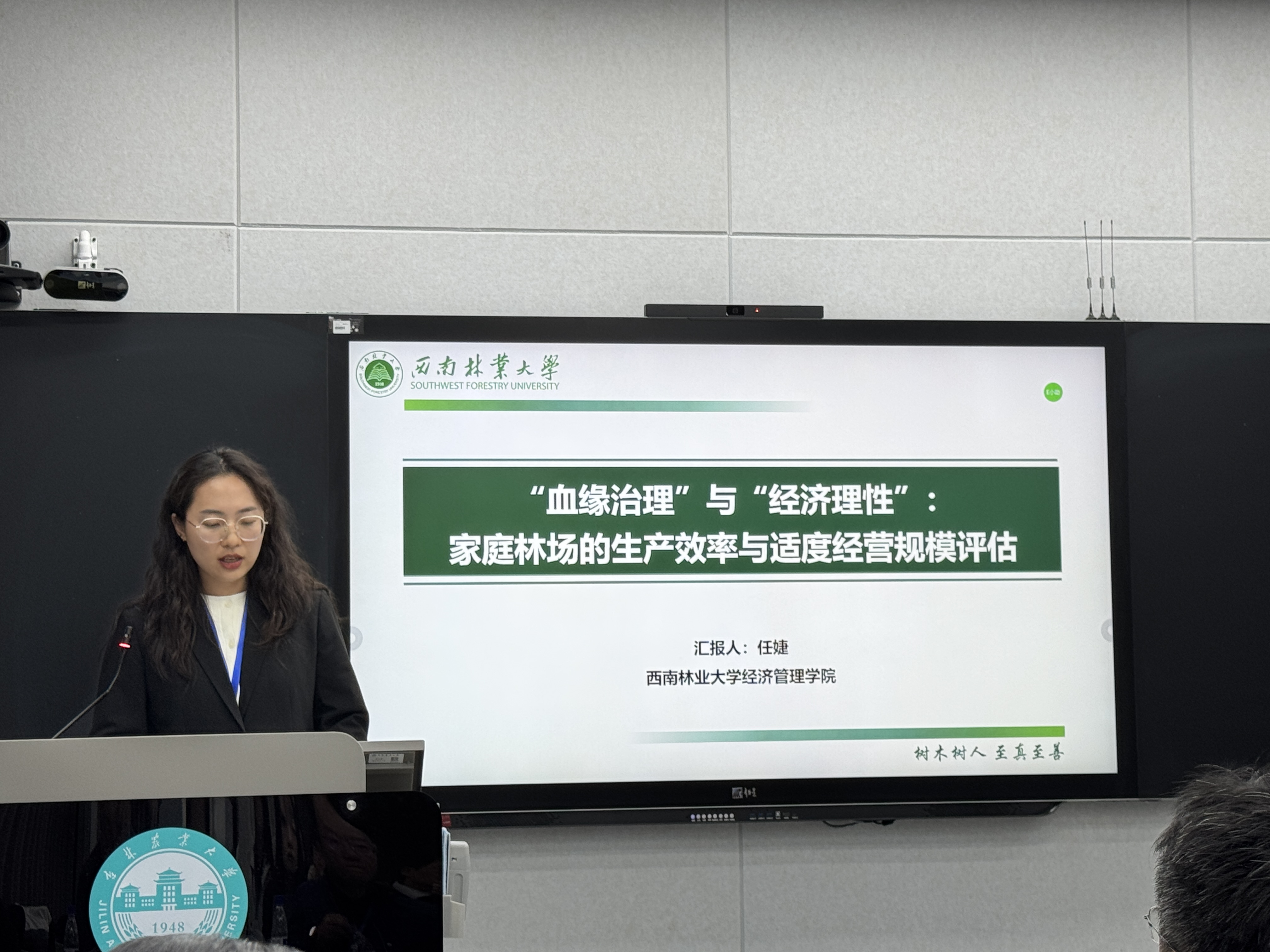 在林业经济与政策分会场上,任婕老师以《“血缘治理”与“经济理性”:家庭林场的生产效率与适度经营规模评估》为题,从社会学与经济学交叉视角剖析了家庭林场经营模式的内在机制,为乡村振兴背景下林业经营模式优化提供了理论支撑,引发与会学者热烈讨论。在林下经济分会场中,硕士研究生杨选琴则聚焦区域特色产业,做题为《云南省保山市林下中药材种植成本收益分析》的报告,为西南地区林下经济发展提供了实践参考。参会期间,公司师生积极与北京林业大学、东北林业大学等高校的科研团队就林业碳汇、生态产品价值实现等热点议题展开深入探讨。