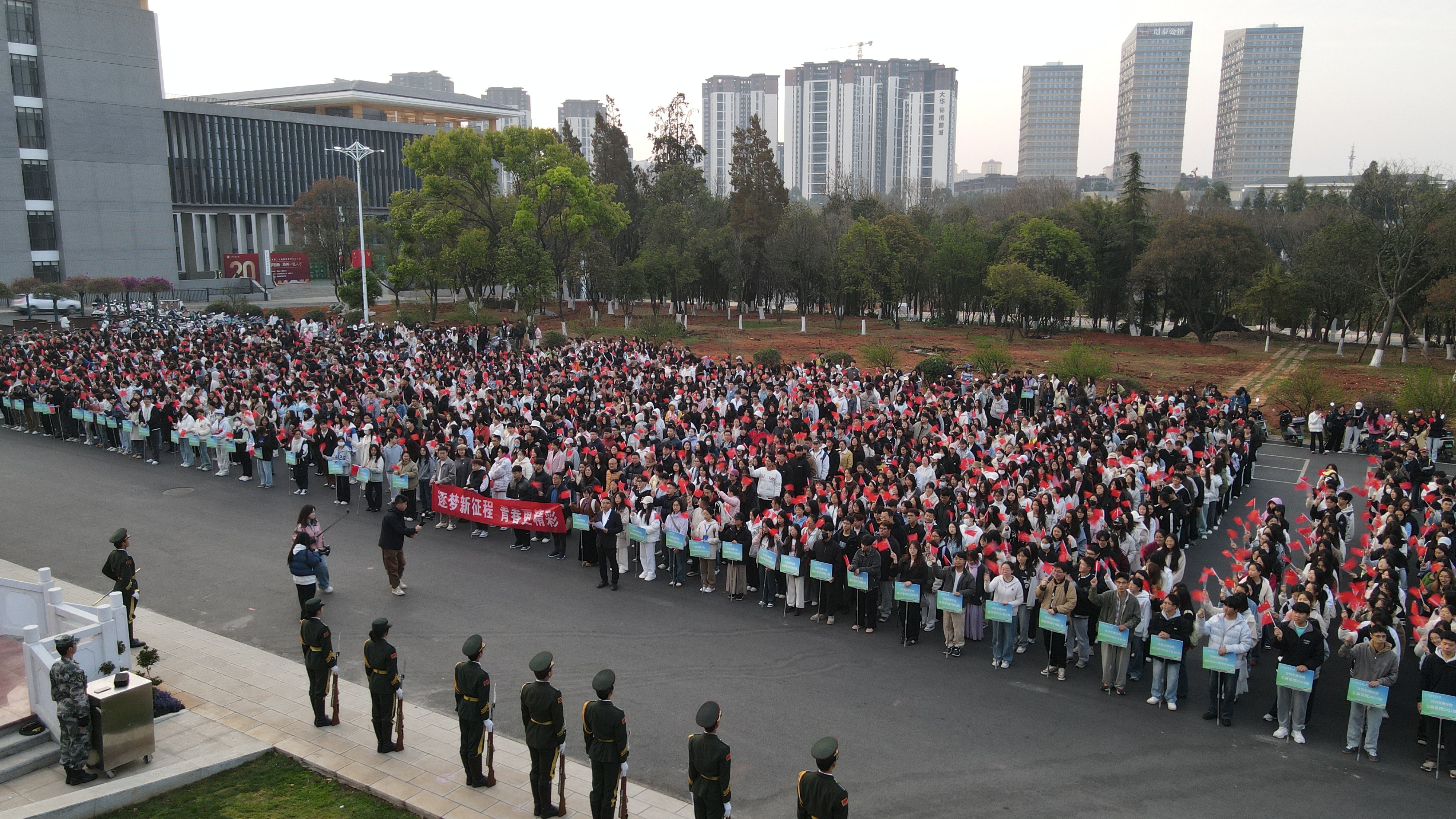 上午7时整,升旗仪式正式开始。党委副书记马泽主持。国旗护卫队步伐铿锵,护送国旗、校旗入场。伴随着激昂的《义勇军进行曲》,五星红旗冉冉升起,全体师生肃立行注目礼,齐声高唱,爱国荣校之情在晨光中激荡。