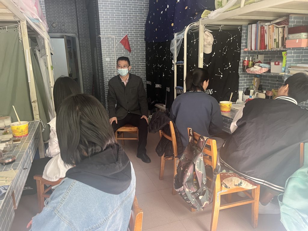 老师与同学们进行亲切地交流,了解同学们的生活状态。在交流的过程中,同学们提出一些对疫情防控措施的问题,胡晓书记积极地给予答复,叮嘱同学们要调整好自己的心态,设立好学习目标,以饱满的精神状态投入到学习生活中去。要求同学们增强疫情防控意识,自觉履行疫情防控规定,遵守校纪校规,非必要不外出;提醒同学们做好宿舍开窗透气,保持空气流通,防止季节性疾病传播。