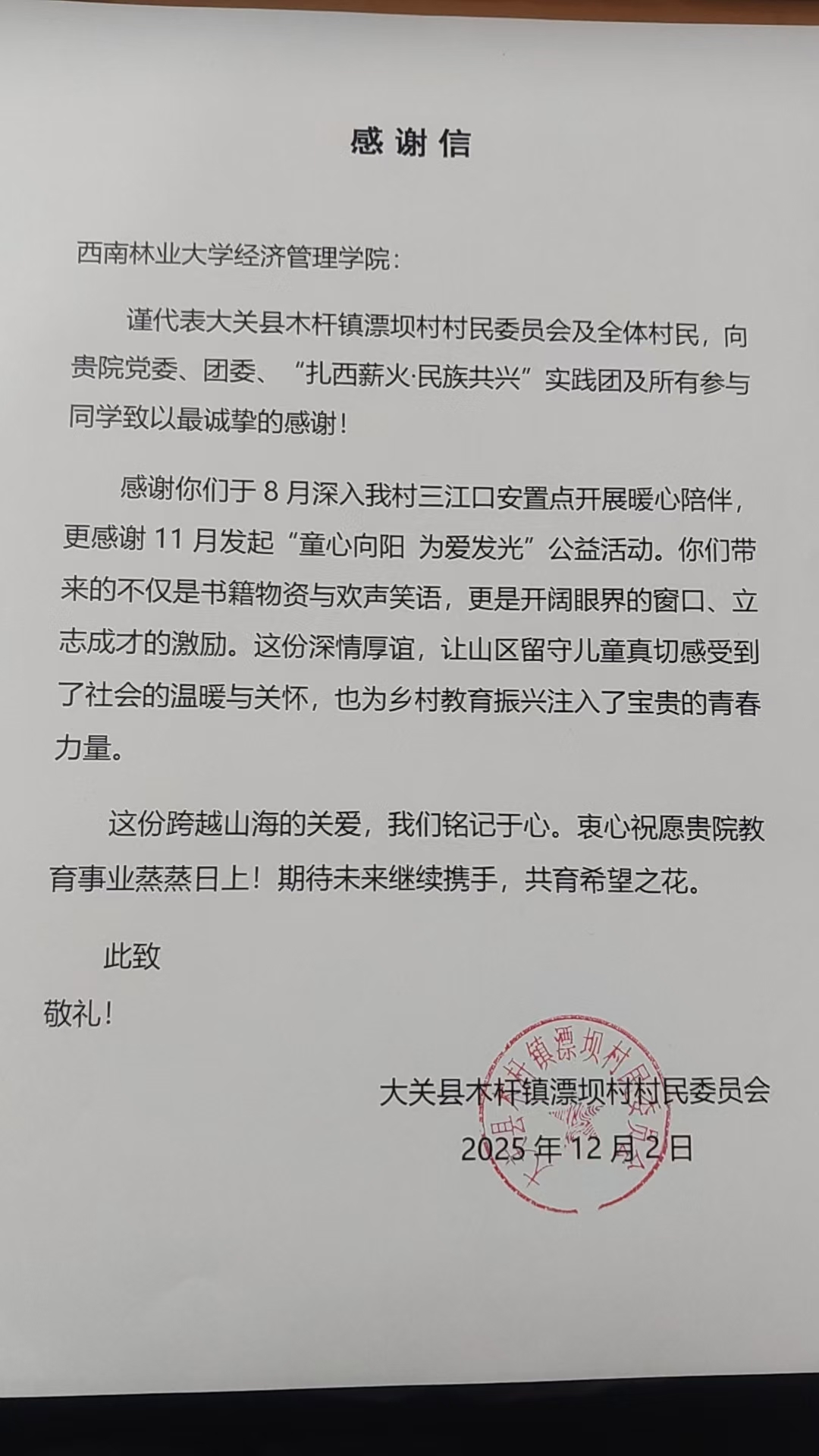 近日,公司收到一封来自昭通市大关县木杆镇漂坝村村民委员会的感谢信,信中对公司党委、团委、“扎西薪火·民族共兴”实践团及所有参与帮扶活动的师生,表达了深深的感谢与诚挚的敬意。